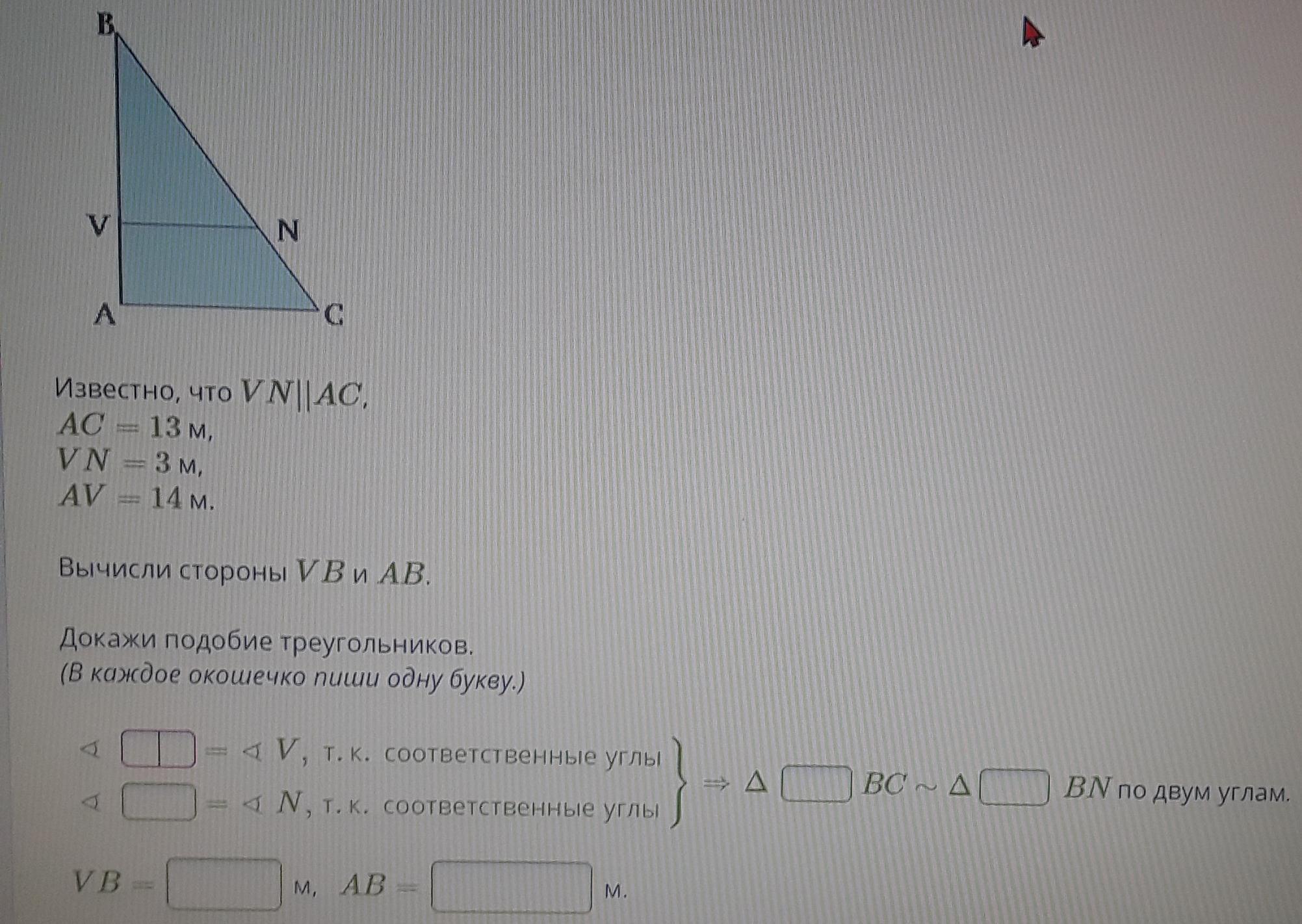 Треугольники ABC и VBN подобны по равным углам (из параллельности прямых VN и AC)
