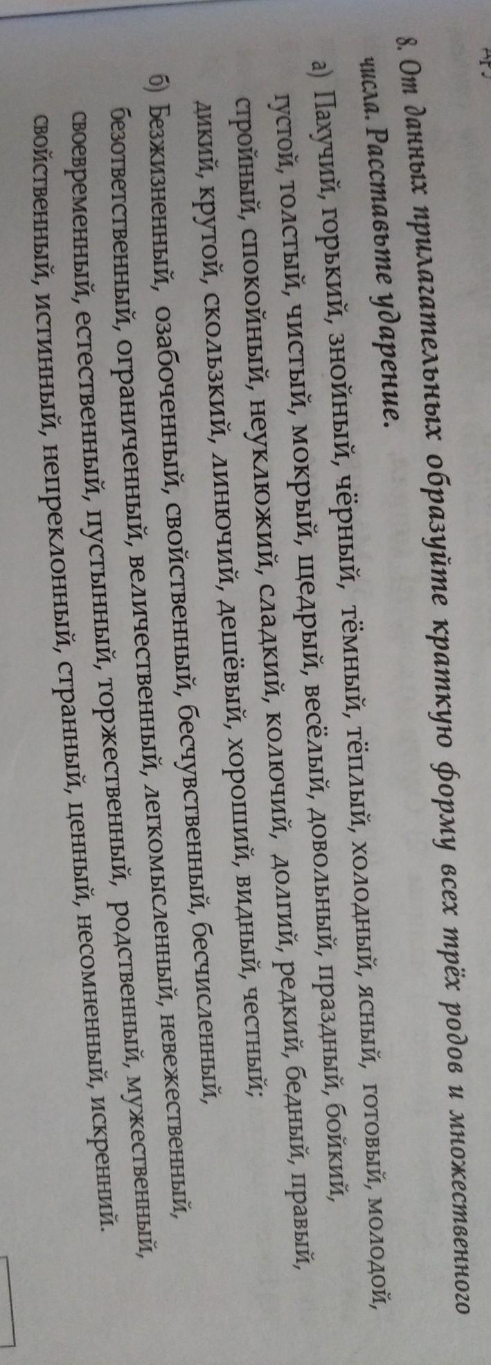 А) ПахУч, пахУч, пахУчи, гОрек, горькА, горькИ, знОен, знойнА, знойнЫ, чЁрен, чернА, чернЫ, тЁмен, темнА, темнЫ, тЁпел, теплА, теплЫ, хОлоден, холоднА, холоднЫ, Ясен, яснА, яснЫ, готОв, готОва, готОвы, мОлод, молодА, молодЫ, гУст, густА, густЫ, тОлст, толстА, толстЫ, чИст, чистА, чистЫ, мОкр, мокрА, мокрЫ, щЕдр, щедрА, щедрЫ, вЕсел, весела, веселЫ, довОлен, довольнА, довОльны, прАзден, празднА, празднЫ, бОек, бойкА, бойкИ, стрОен, стройнА, стройнЫ, спокОен, спокОйна, спокОйны, неуклЮж, неуклЮжа, неуклЮжи, слАдок, сладкА, сладкИ, колЮч, колЮча, колЮчи, дОлог, долгА, дОлги, рЕдок, редкА, редкИ, бЕден, беднА, беднЫ, прАв, правА, прАвы, дИк, дикА, дикИ, крУт, крутА, крутЫ, скОльзок, скользкА, скользкИ, линЮч, линЮча, линЮчи, дЁшев, дЁшева, дЁшевы, хорОш, хорошА, хорошИ, вИден, виднА, виднЫ, чЕстен, честнА, честнЫ.