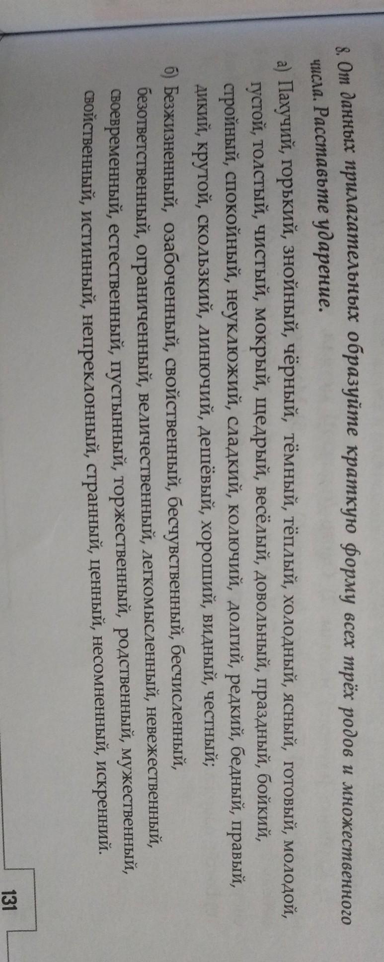 А) ПахУч, пахУч, пахУчи, гОрек, горькА, горькИ, знОен, знойнА, знойнЫ, чЁрен, чернА, чернЫ, тЁмен, темнА, темнЫ, тЁпел, теплА, теплЫ, хОлоден, холоднА, холоднЫ, Ясен, яснА, яснЫ, готОв, готОва, готОвы, мОлод, молодА, молодЫ, гУст, густА, густЫ, тОлст, толстА, толстЫ, чИст, чистА, чистЫ, мОкр, мокрА, мокрЫ, щЕдр, щедрА, щедрЫ, вЕсел, весела, веселЫ, довОлен, довольнА, довОльны, прАзден, празднА, празднЫ, бОек, бойкА, бойкИ, стрОен, стройнА, стройнЫ, спокОен, спокОйна, спокОйны, неуклЮж, неуклЮжа, неуклЮжи, слАдок, сладкА, сладкИ, колЮч, колЮча, колЮчи, дОлог, долгА, дОлги, рЕдок, редкА, редкИ, бЕден, беднА, беднЫ, прАв, правА, прАвы, дИк, дикА, дикИ, крУт, крутА, крутЫ, скОльзок, скользкА, скользкИ, линЮч, линЮча, линЮчи, дЁшев, дЁшева, дЁшевы, хорОш, хорошА, хорошИ, вИден, виднА, виднЫ, чЕстен, честнА, честнЫ.
