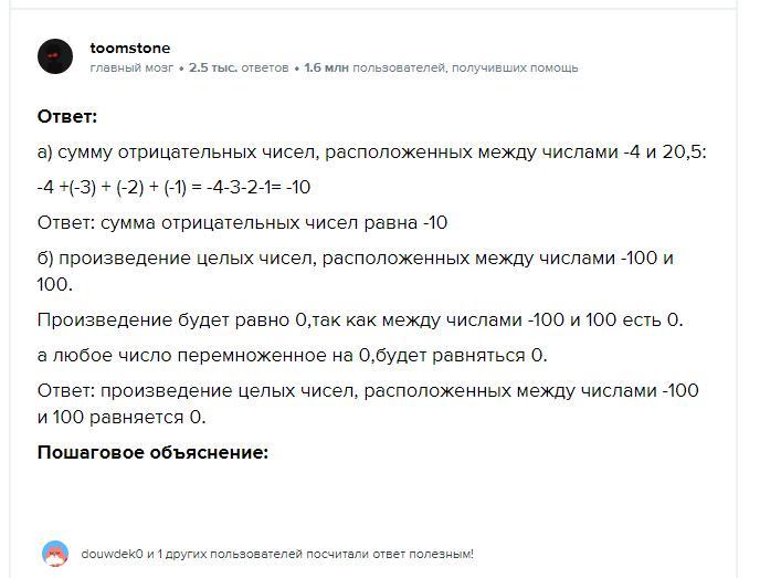 а) сумму отрицательных чисел, расположенных между числами -4 и 20,5;