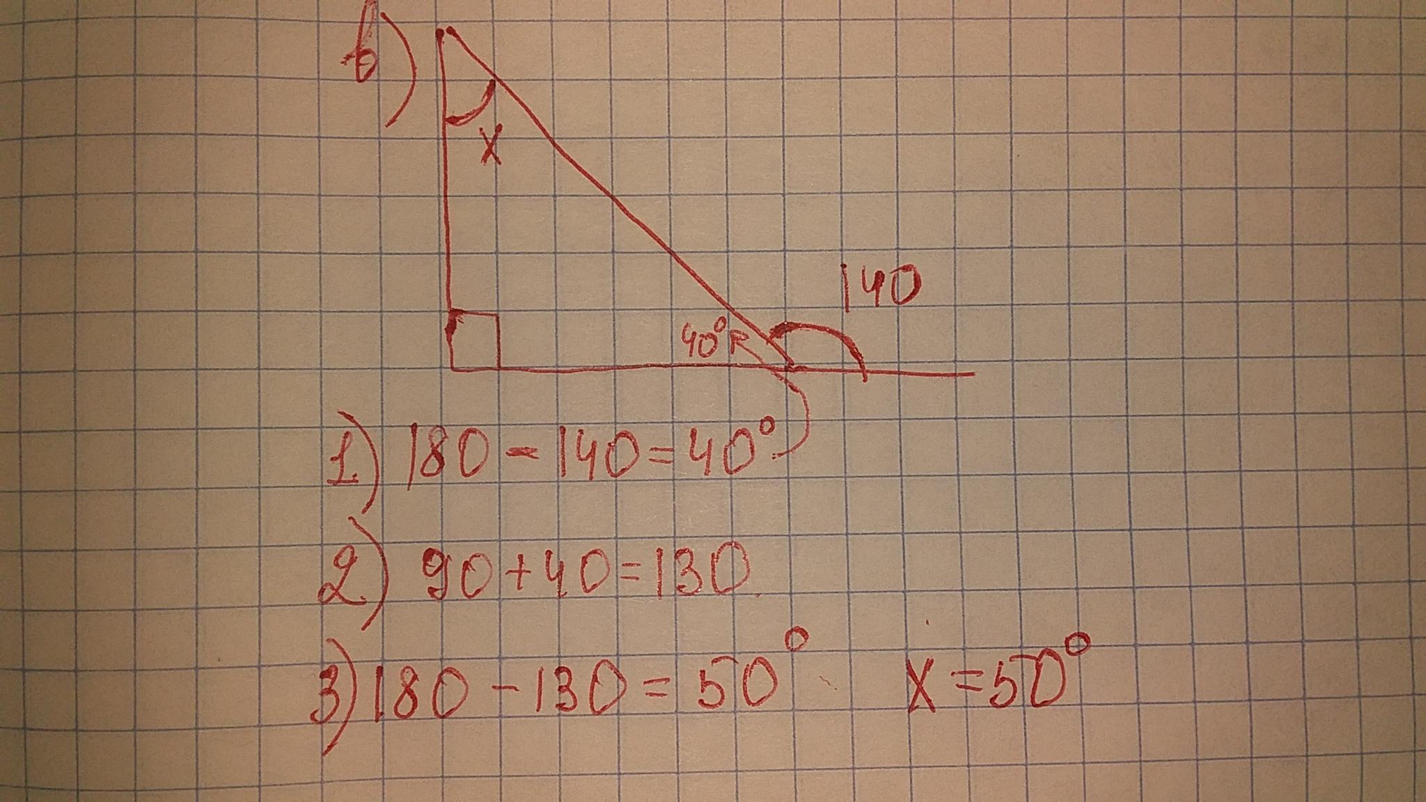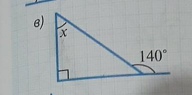 т.к один угол 90 (на чертеже это отображено), второй равен 180-140=40. ну а третий, тот, который необходимо найти равняется 180-40-90=50