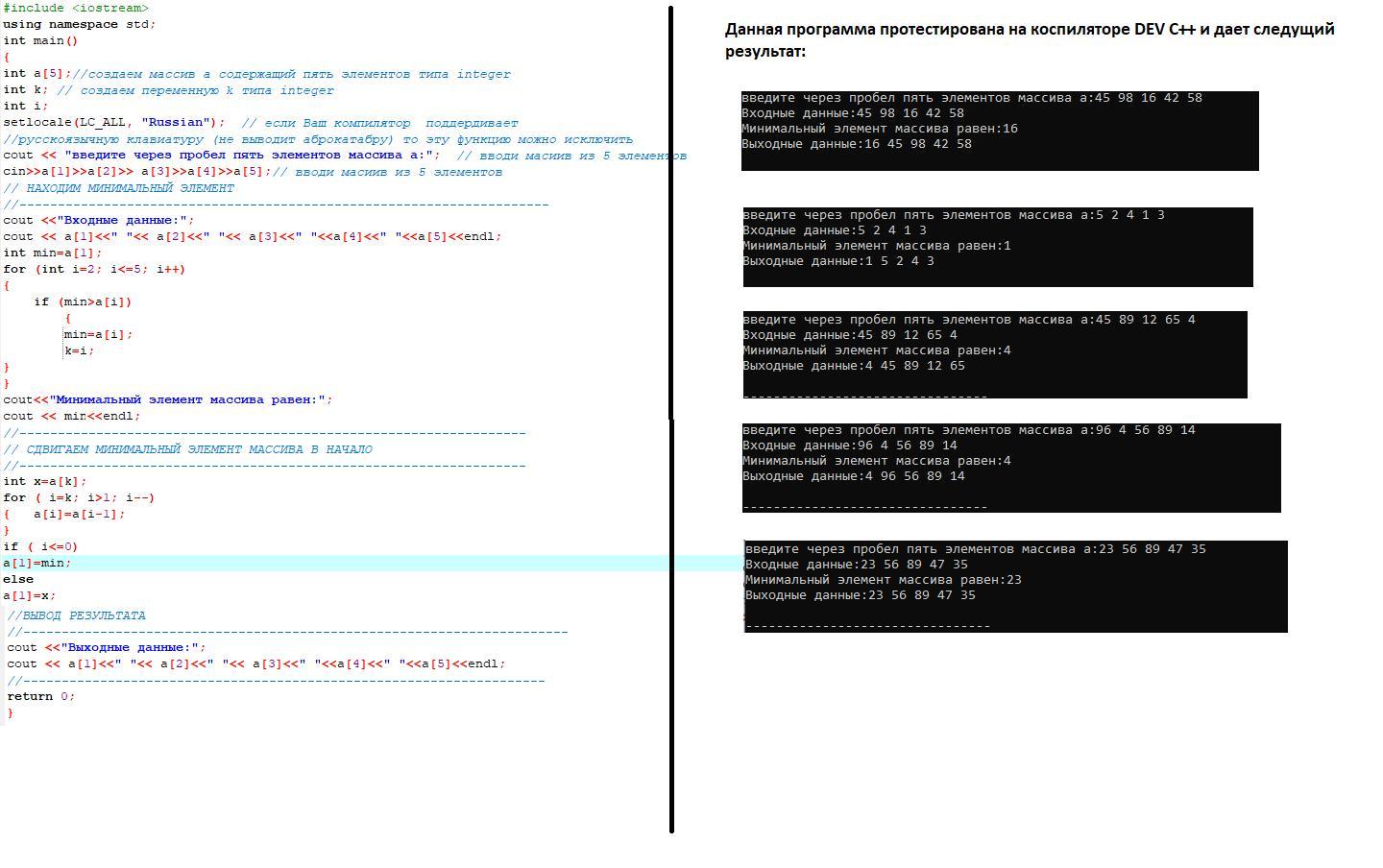 Дан массив a из n элементов. Требуется найти минимум массива и вставить его в начало, порядок других элементов сохранить. Если минимальных элементов несколько, переместить первый найденный минимальный элемент массива.