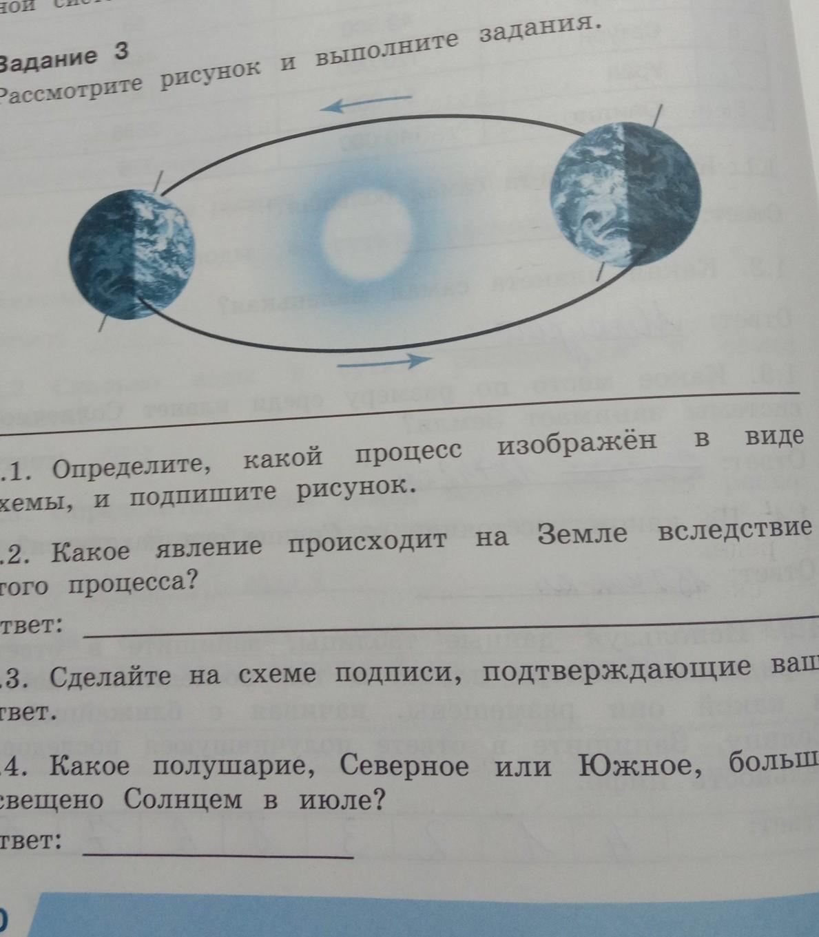 3) Если предположить, что вверху Северный полюс, то в левом положении планеты там лето (на полюсе Солнце не заходит при вращении Земли вокруг собственной оси (при суточном вращении полярный день)), в правом положении там зима (на полюсе Солнце не восходит при вращении Земли вокруг собственной оси (при суточном вращении полярная ночь)).