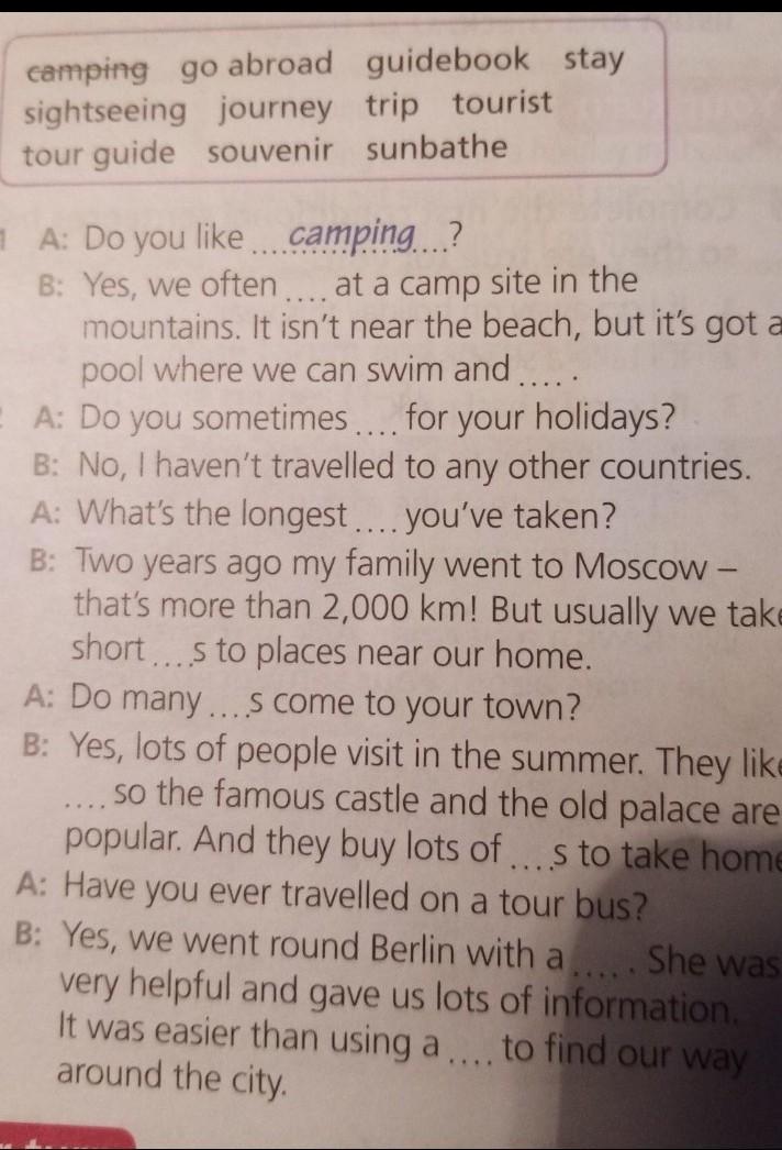 1 camping 2 stay 3 sunbathe 4vgo abroad 5 trip journeys tourists 8 sightseeing 9 souvenirs 10 tour guide