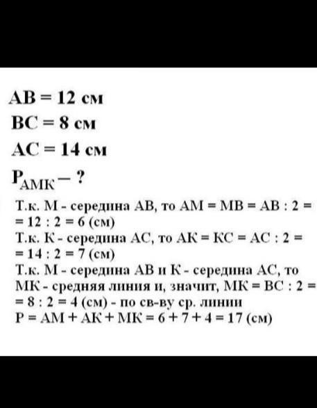80 БАЛЛОВ! точки м и н середины сторон аб и ас треугольника абк найдите периметр треугольника амн равен 28 см