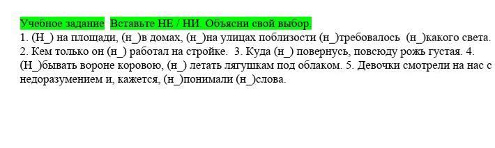Не на площади, не в домах, не на улицах поблизости не требовалось ни какого света. 2)кем ТОЛЬКО он не был работал на стройке. 3)Куда ни повернусь, повсюду рожь густая. 4)не бывать вороне коровою, ни летать лягушкам под облаком. 5)девочки смотрели на нас с недорузением и, кажется, не понимали ни слова