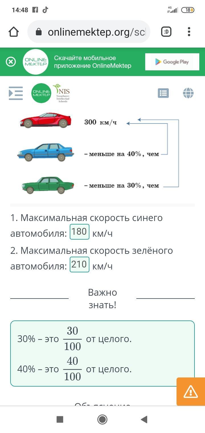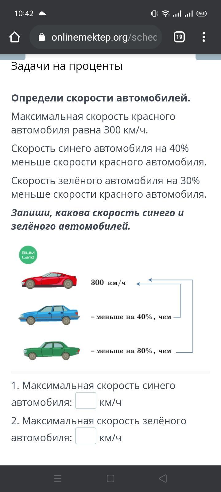 Ответ: у синего автомобиля 120 км в час, а у зеленого автомобиля 90 км в час