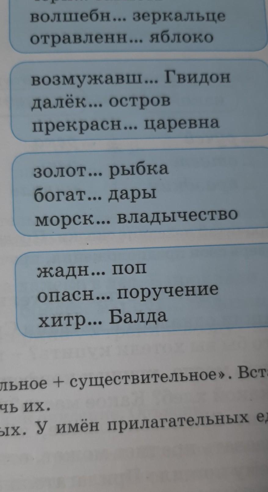 волшебнОЕ зеркальце, отравленнОЕ яблоко, возмужавшИЙ Гвидон, далекИЙ остров, прекраснАЯ царевна, ЗолотАЯ рыбка, богатЫЕ дары, морскОЕ владычество, жаднЫЙ поп, опаснОЕ поручение, хитрАЯ балда.
