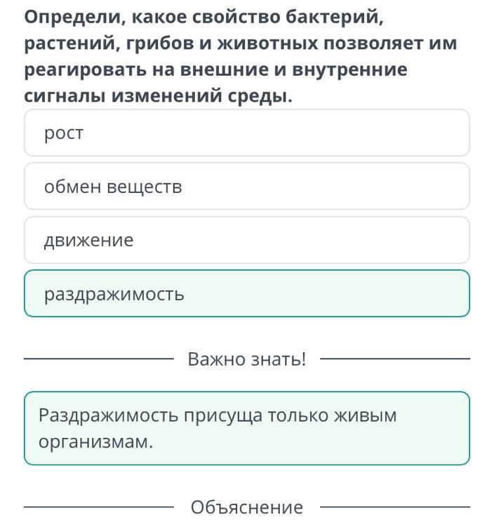 Определи, какое свойство бактерий, растений, грибов и животных позволяет им реагировать на внешние и внутренние сигналы изменений среды.