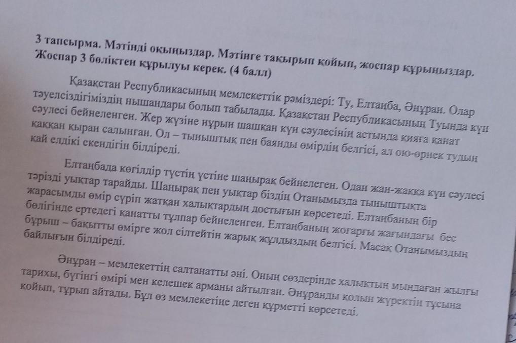 Жоспар 3 бөліктен құрылуы керек. (4 балл)