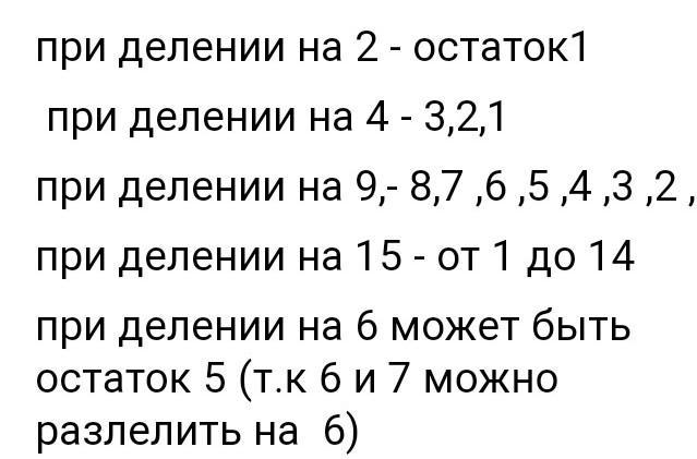 1) При делении на 2 может получиться остаток только 1, при делении на 4: 1, 2, 3; на 9: 1, 2, 3, 4, 5, 6, 7, 8, на 15: 1, 2, 3, 4, 5, 6, 7, 8, 9, 10, 11, 12, 13, 14.
