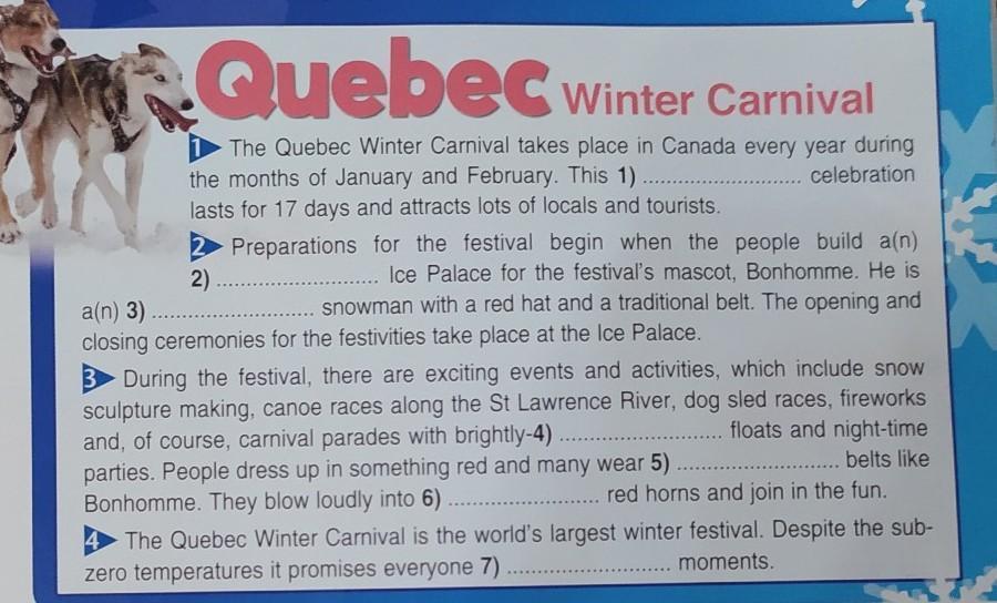 During the festival, there are exciting events and activities, which include snow sculpture making, canoe races along the St Lawrence River, dog sled races, fireworks and, of course, carnival parades with brightly 4) decorated floats and nighttime parties. People dress up in something red and many wear 5) ...traditional belts like Bonhomme. They blow loudly into 6)... long red horns and join in the fun.
