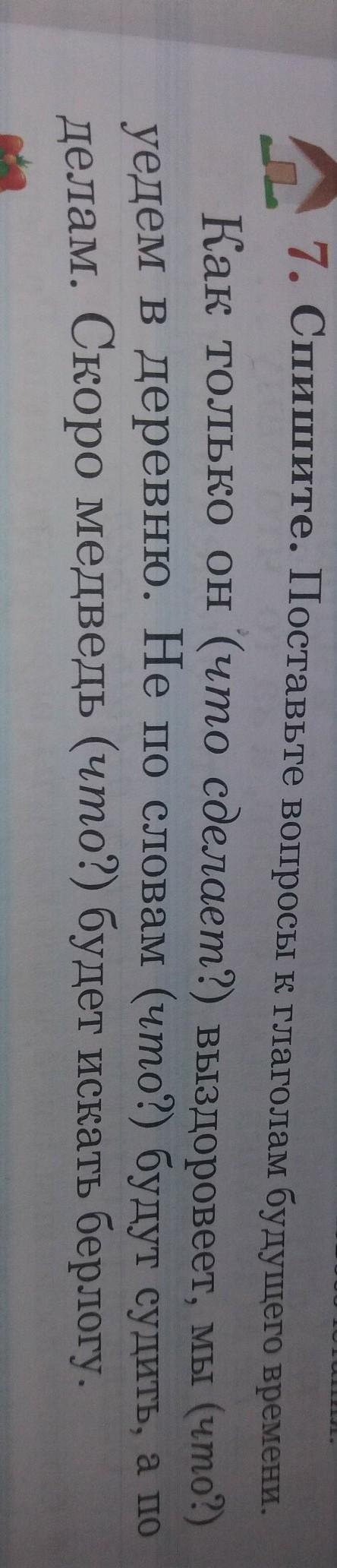 Как только он(что сделает?) выздоровеет. Мы(что сделаем?) уедем в деревню. Не по словам (что сделают?) будут судить,а по делам. Скоро медведь ( что сделает?) будет искать берлогу.