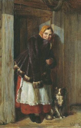 Девушка небрежно накинула на себя шубку, не успев продеть руку в рукав. На ней длинное красное платье и белый передник. Голова ее повязана платком. Девушка улыбается. Пришедший принес ей радость и счастье. Хоть тона картины и не очень яркие, она вызывает исключительно положительные эмоции, ведь у кого-то вот-вот произойдет долгожданная встреча.