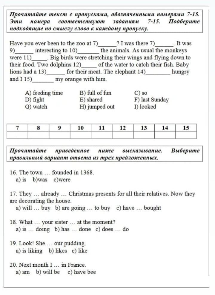 Have you ever been to the zoo at 7)last Sunday? I was there 8)full of fun. It was 9)so interesting to 10)watch the animals. As usual the monkeys were 11)fight. Big birds were stretching their wings and flying down to their food. Two dolphins 12)jump out of the water to catch their fish. Baby lions had a 13)feeding time for their meat. The elephant 14)looked hungry and I 15)shared my orange with him