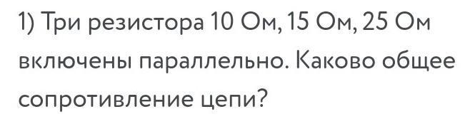 R=R1*R2*R3/(R1+R2+R3)=10 Ом*15 Ом*25 Ом/(10 Ом+15 Ом+25 Ом)=75 Ом