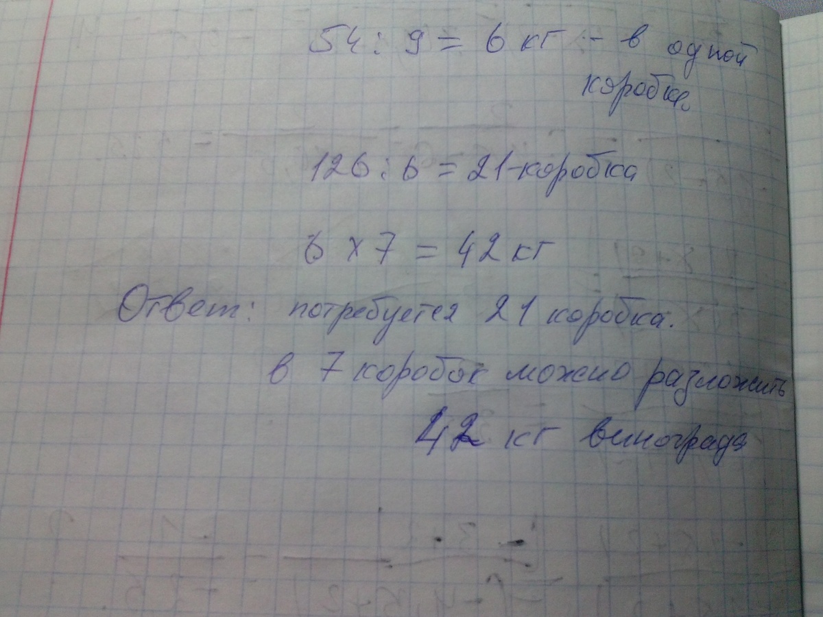 в 9 коробок разложили 54 кг винограда поровну в каждую.Сколько потребуется таких коробок чтобы разложить 126 кг винограда?