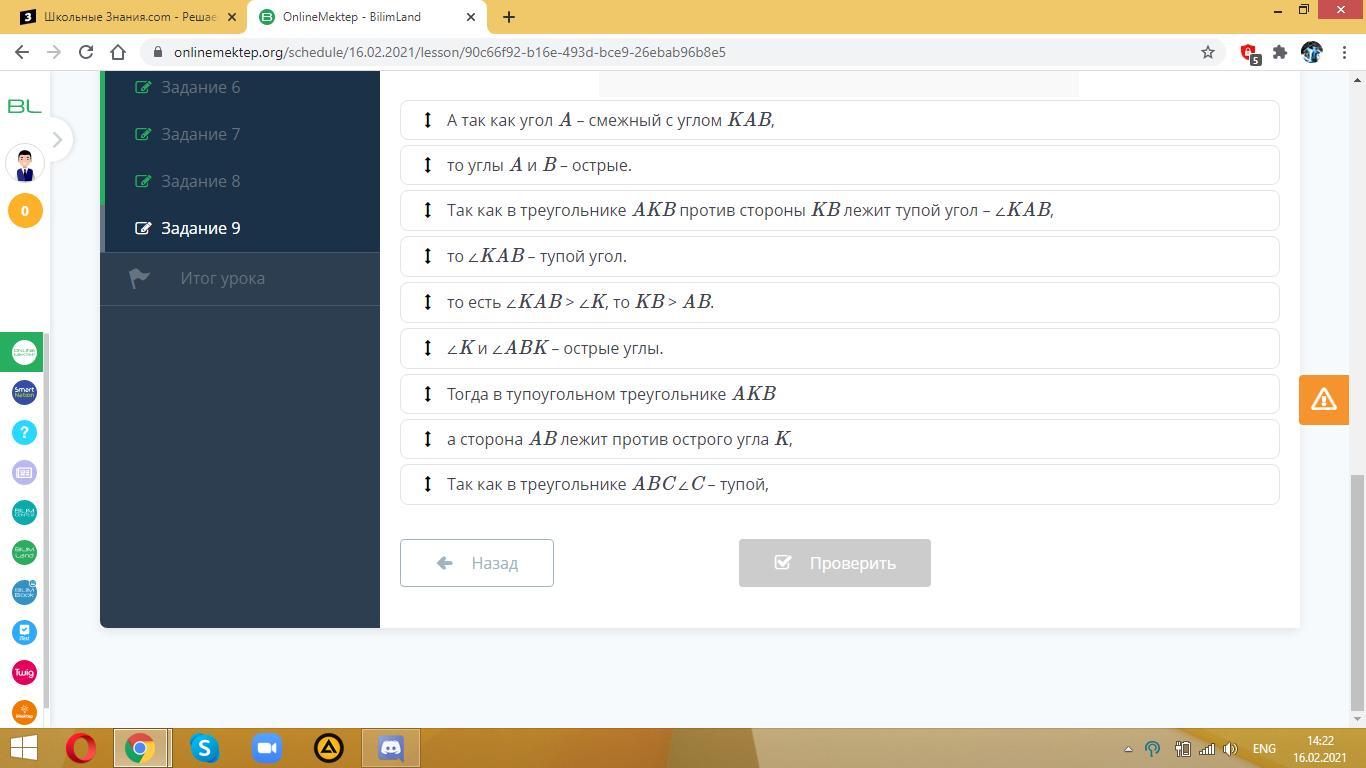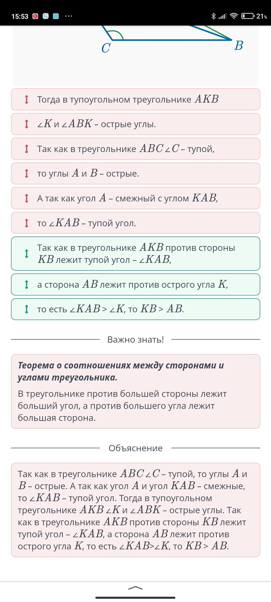 ) C; 2)АВ; 3)MN = MK < NK; 4)AC, BC, AB; 5)XY > XZ, YZ > XY 6)NM-LM-LN-KL-KN 7) K=28. M=40. N=112; 8) >, >, >, 80, меньше, острый; 9) 1.Так как в треугольнике АВС..., 2.то углы Аи В, 3.А так как угол А, 4.то КАВ - тупой..., 5.Тогда в тупоугольном... 6.К и АВК... 7.Так как в треугольнике ...8.а сторона... 9.то есть ....
