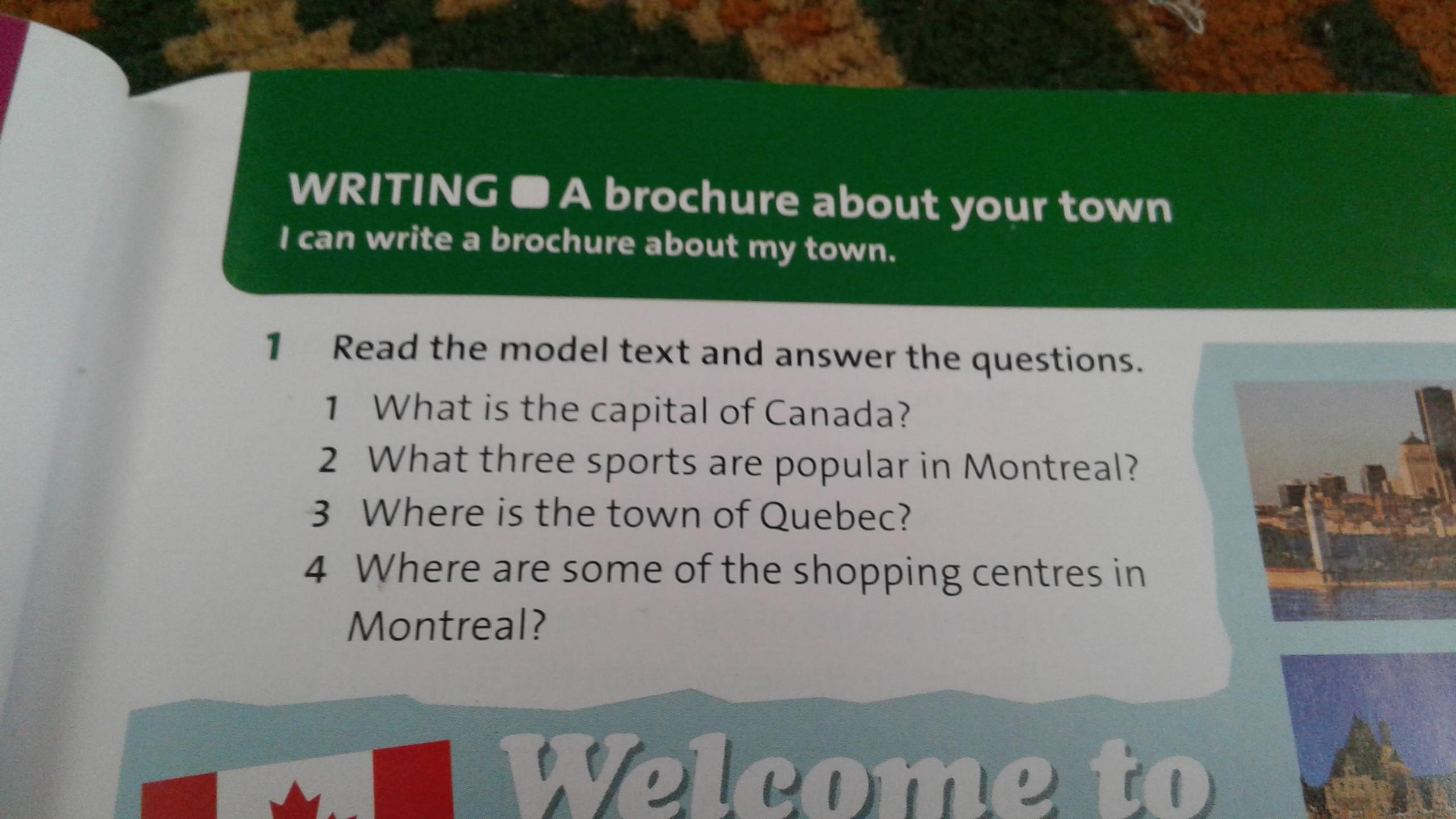 Read the model text and answer the question.1.What is the capital of Canada? What three sports are popular in Montreal? 3. Where is the town of Quebec?4.where are some of the shopping centres in Montreal?