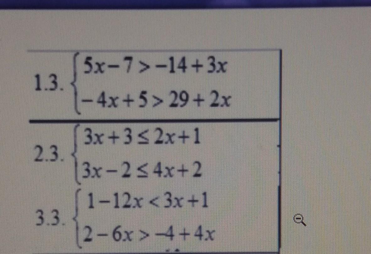 1.3 . { 5x - 7 > - 14 + 3x , ⇒ { 5x - 3x > - 14 + 7 , ⇒ { x > - 3,5 ,