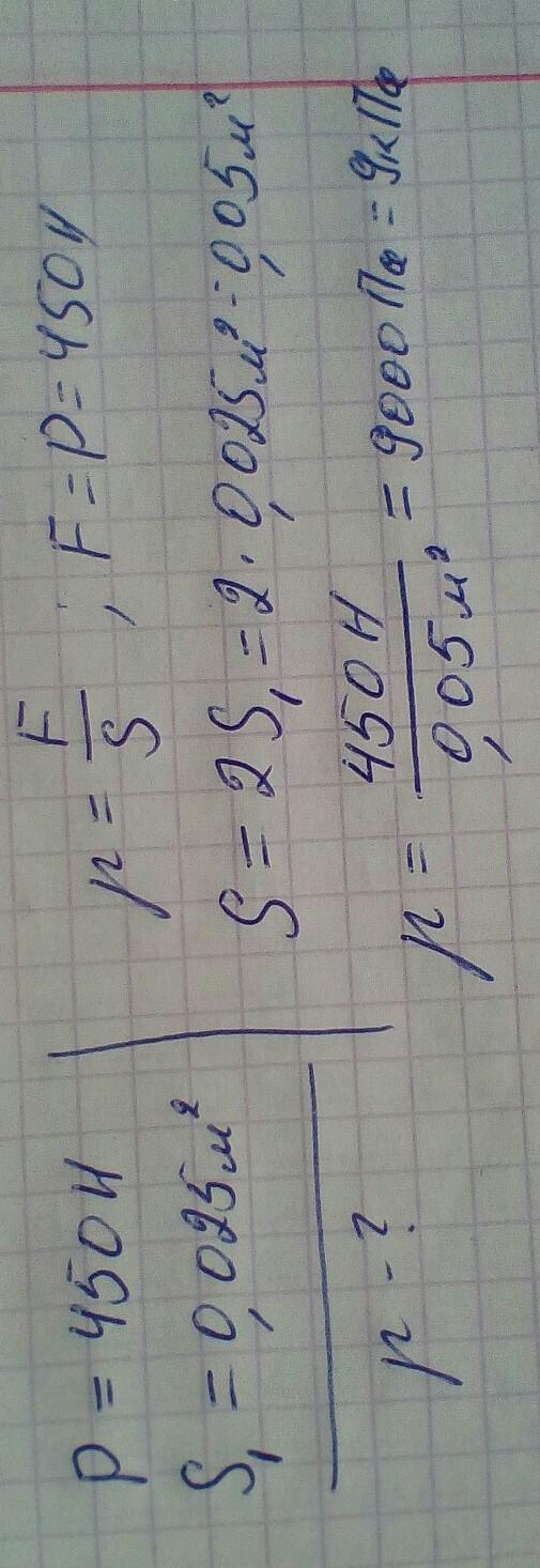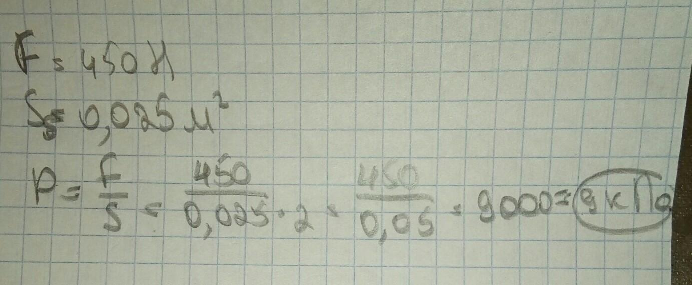 S одного ботинка 0,025, поэтому умножаем на 2.. По формуле Р=F/S подставляем числа