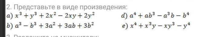 a) x^3 +y^3 +2x^2 -2xy+2y^2=(x+y)(x^2 -xy+y^2)+2(x^2 -xy+y^2)=(x+y+2)(x^2 -xy+y^2) и так далее в том же духе.