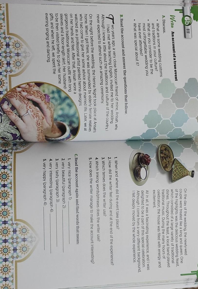 C. Read the account again and find words that mean: 1. very nice (paragraph 1). 2. very beautiful (paragraph 2): 3. very tasty (paragraph 3). 4. very interesting (paragraph 4). 5. very happy (paragraph 4);