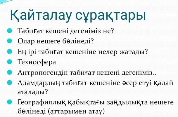 1. Табиғат кешені - табиғат компоненттерінің өзара байланысуынан пайда болатын табиғаттың бір бөлігі. мысалы, табиғи зоналар, биоценоз, климаттық белдеулер.