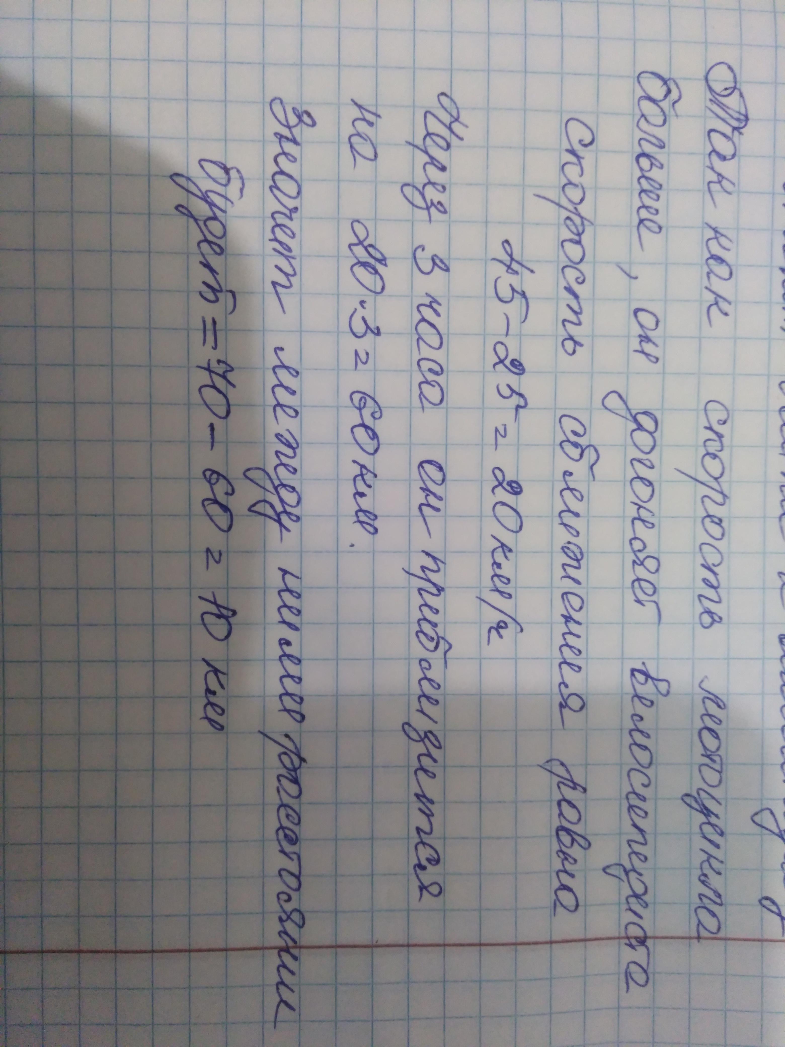 Мотоциклист выехал вдогонку за велосипедистом. Сейчас между ними 70 км. Скорость велосипедиста 25 км/ч, а скорость мотоциклиста — 45 км/ч. Какое расстояние будет между ними через 3 часа?