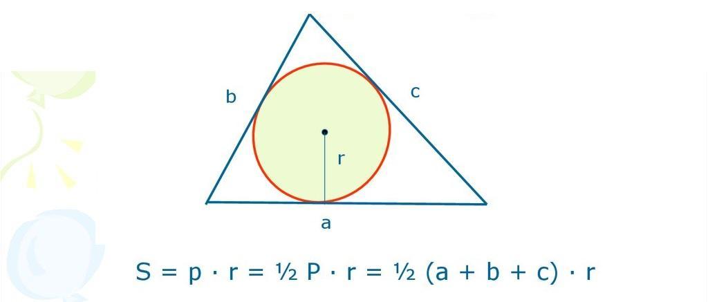 По формуле площади треугольника S = 0,5 * P * r, где P - периметр треугольника, S - площадь треугольника, а r - радиус вписанной окружности.