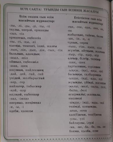 Кестеде берілген 5 сөзді қолданып ,туынды сын есімдерді пайдаланып сөйлем құра.