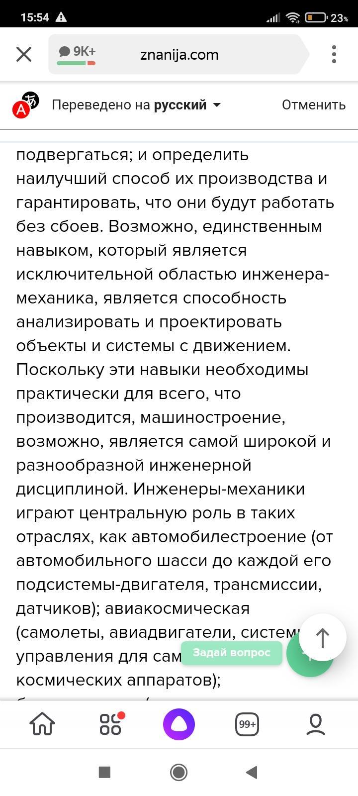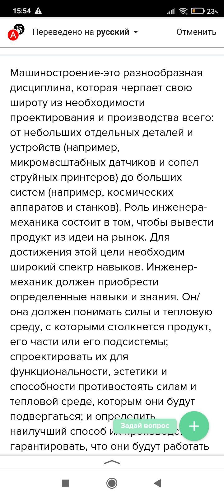 Машиностроение-это разнообразный предмет, который получает свою широту от необходимости проектировать и производить все, от небольших отдельных деталей и устройств (например, микромасштабных датчиков и сопел струйных принтеров) до больших систем (например, космических аппаратов и станков). Роль инженера-механика состоит в том, чтобы вывести продукт из идеи на рынок. Для достижения этой цели необходим широкий спектр навыков. Инженер-механик должен приобрести определенные навыки и знания. Он должен понимать силы и тепловую среду, с которыми столкнется продукт, его части или его подсистемы; спроектировать их с учетом функциональности, эстетики и способности противостоять силам и тепловой среде, которым они будут подвергаться; и определить наилучший способ их изготовления и гарантировать, что они будут работать без сбоев. Возможно, единственным навыком, который является исключительной областью инженера-механика, является способность анализировать и проектировать объекты и системы с движением. Поскольку эти навыки необходимы практически для всего, что производится, машиностроение, возможно, является самой широкой и разнообразной инженерной дисциплиной. Инженеры-механики играет центральную роль в таких отраслях, как автомобилестроение (от шасси автомобиля его каждой подсистемы – двигатель, коробка передач, датчики), аэрокосмической станции.