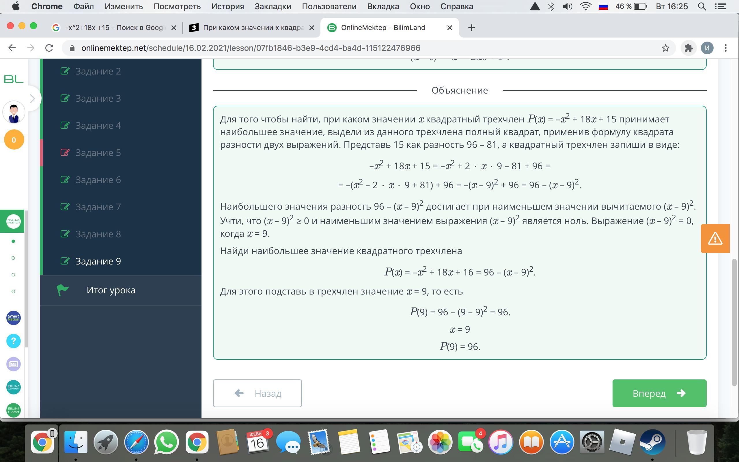 При каком значении x квадратный трехчлен P(x) = –x2 + 18x + 15 принимает наибольшее значение.