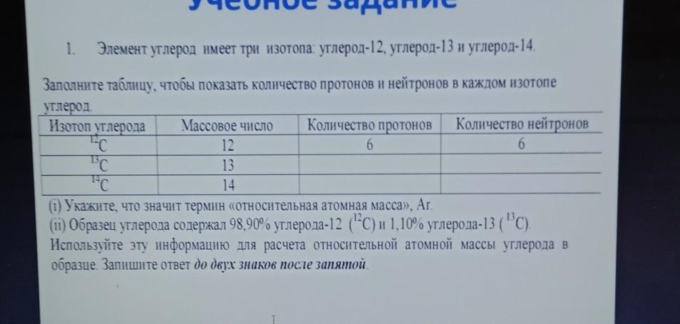 (і) Образец углерода содержал 98,90% углерода-12 (C) и 1,10% углерода-13 (130).