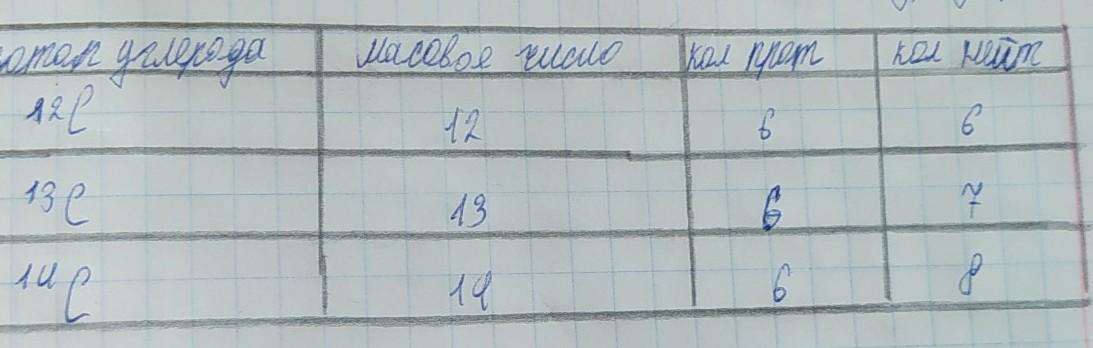 Заполните таблицу, чтобы показать количество протонов и нейтронов в каждом изотопе