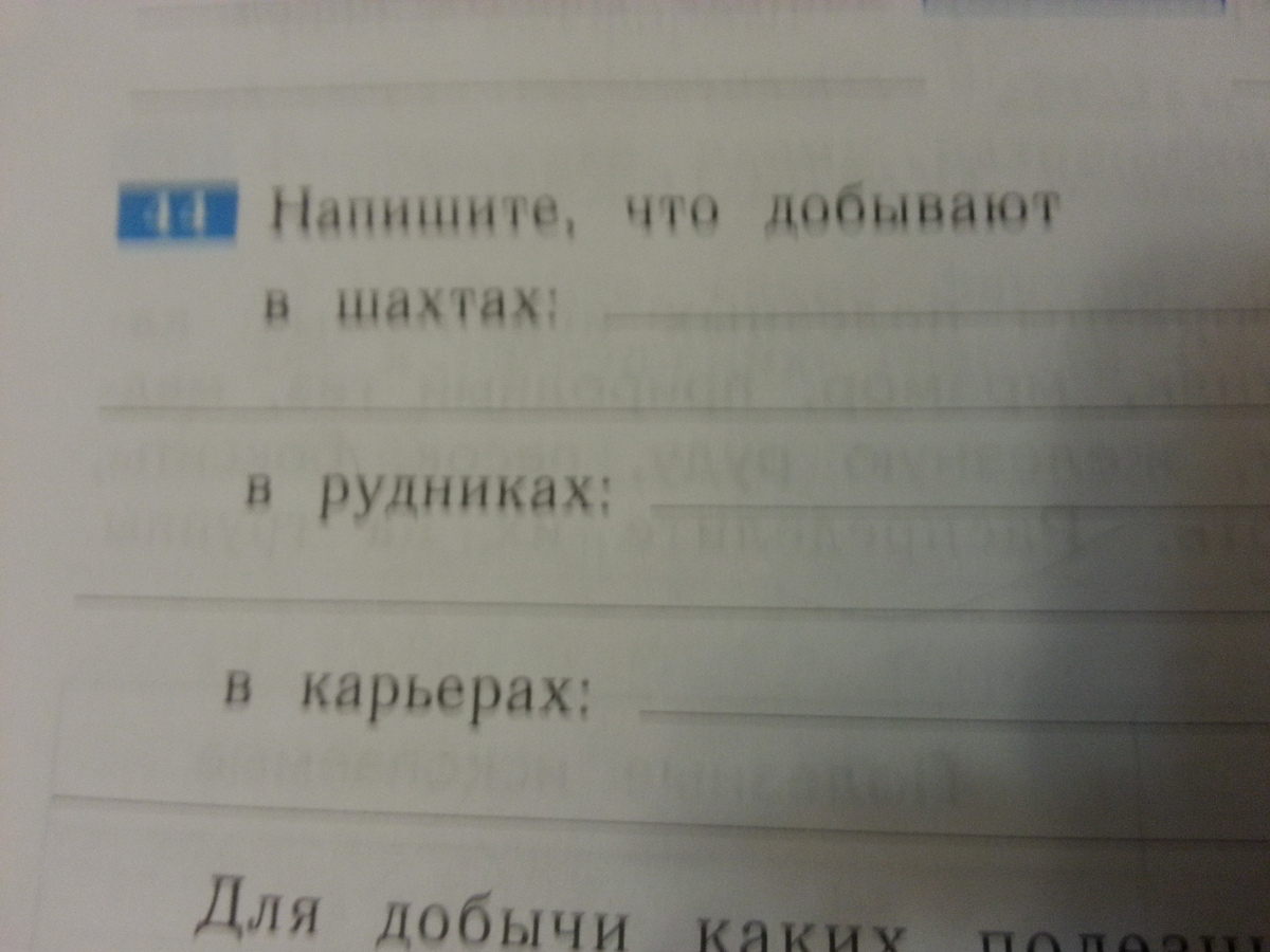 Добывают полезные ископаемые в шахтах( серебро золото и т д) в рудниках железную руду в карьерах песок землю глину