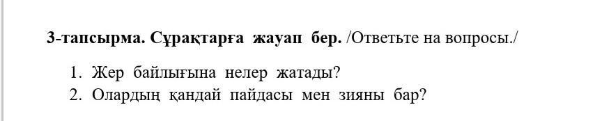 Тапсырма 3. сұрақтарга жауап бер. / ответьте на вопросы. 1. жердің байлығына не жатады? 2. олардың пайдасы мен зияны неде?