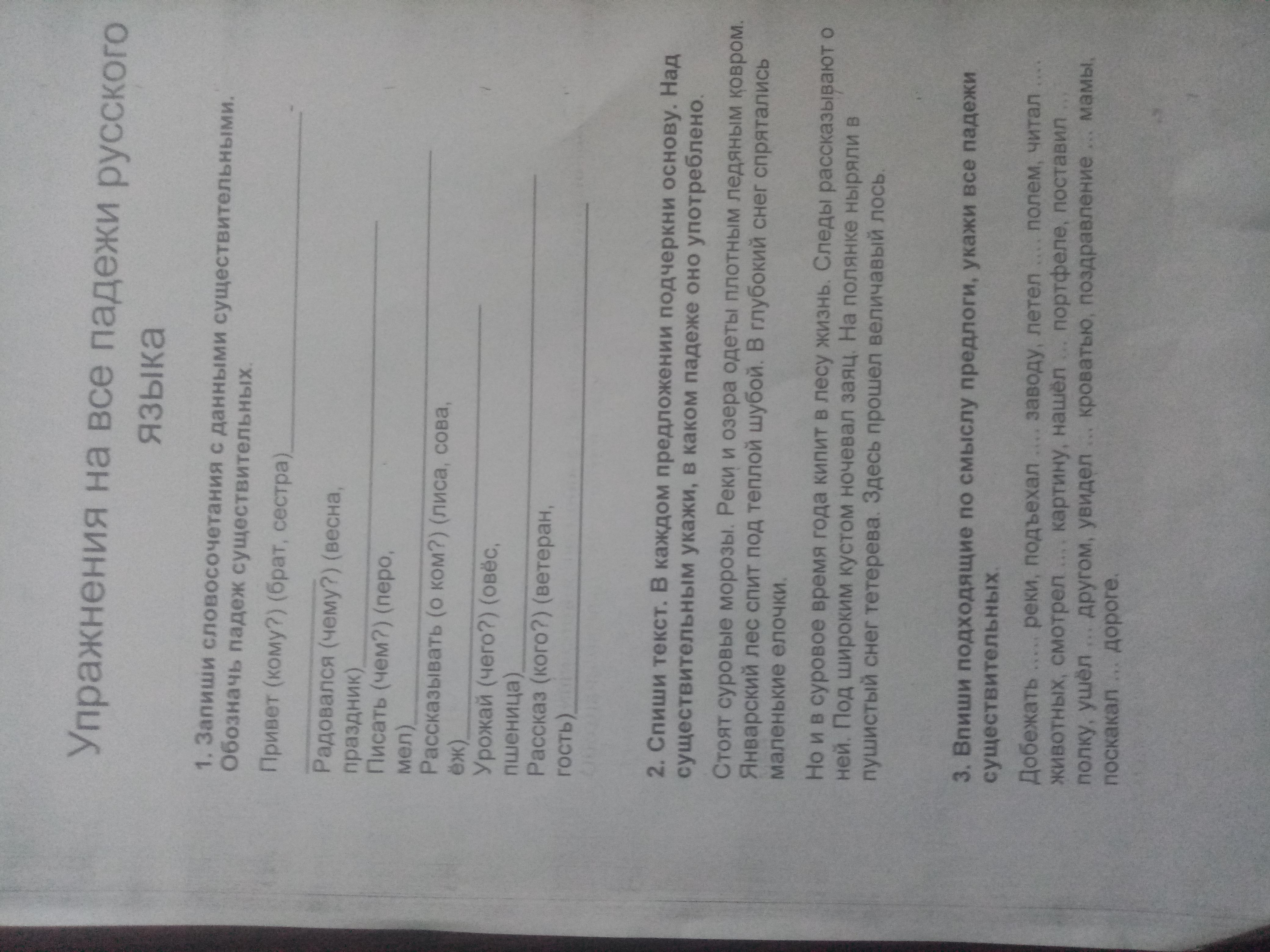 1. Привет сестре(Д.п), привет брату(Д.п), 2. Радовался празднику(Д.п), радоваться весне(Д.п), 3. Писать пером(Т.п), писать мелом(Т.п), 4. Рассказывать о лисе(П.п), рассказывать о сове(П.п), рассказывать о еже(П.п), 5. Урожай овса(Р.п), урожай пшеницы(Р.п), 6. Рассказ ветерана(Р.п), рассказ гостя(Р.п)