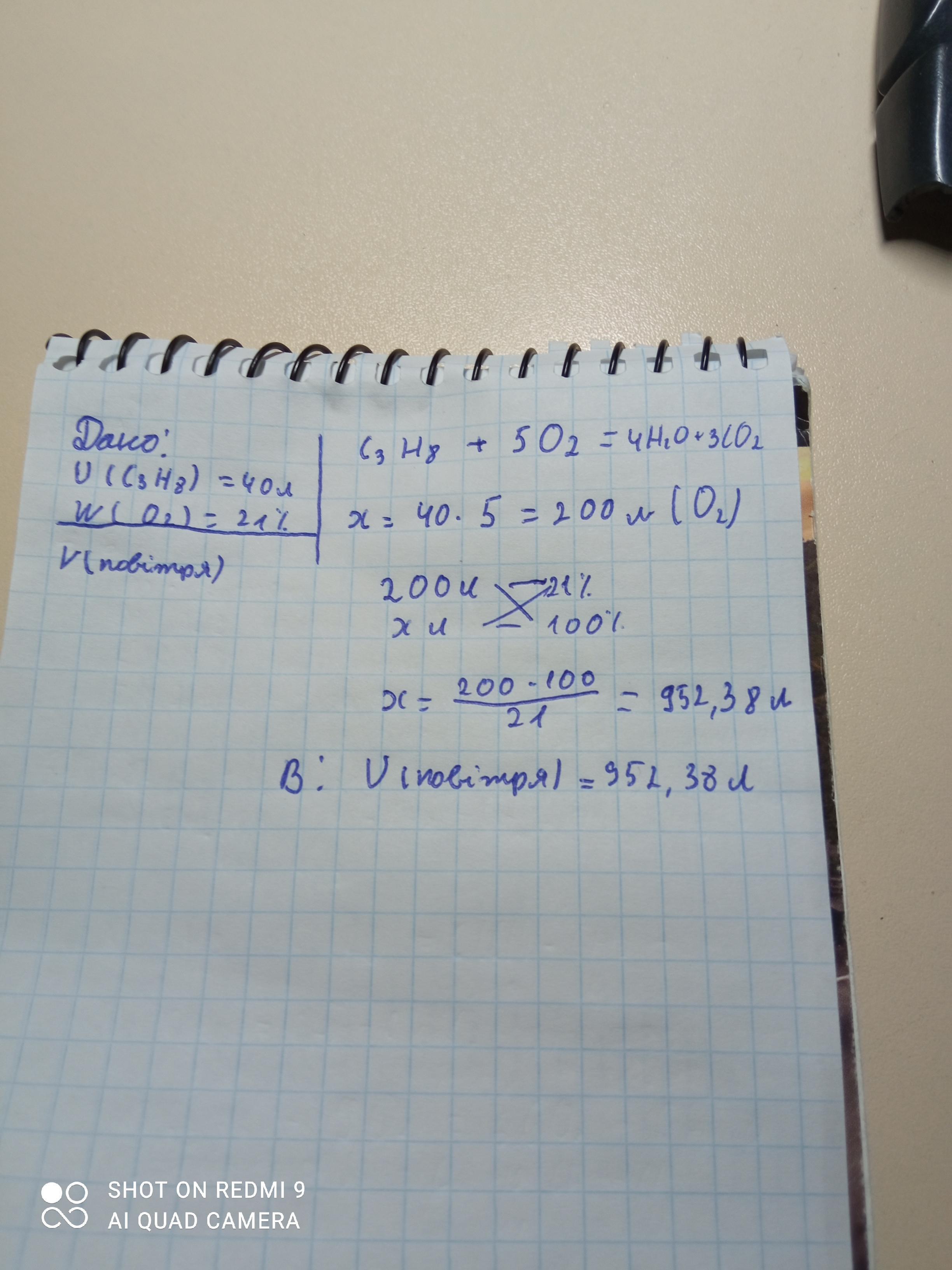 Терміново!!!який об'єм повітря необхідний для спалювання 40 л пропану? Об'ємна частка кисню в повітрі 21%