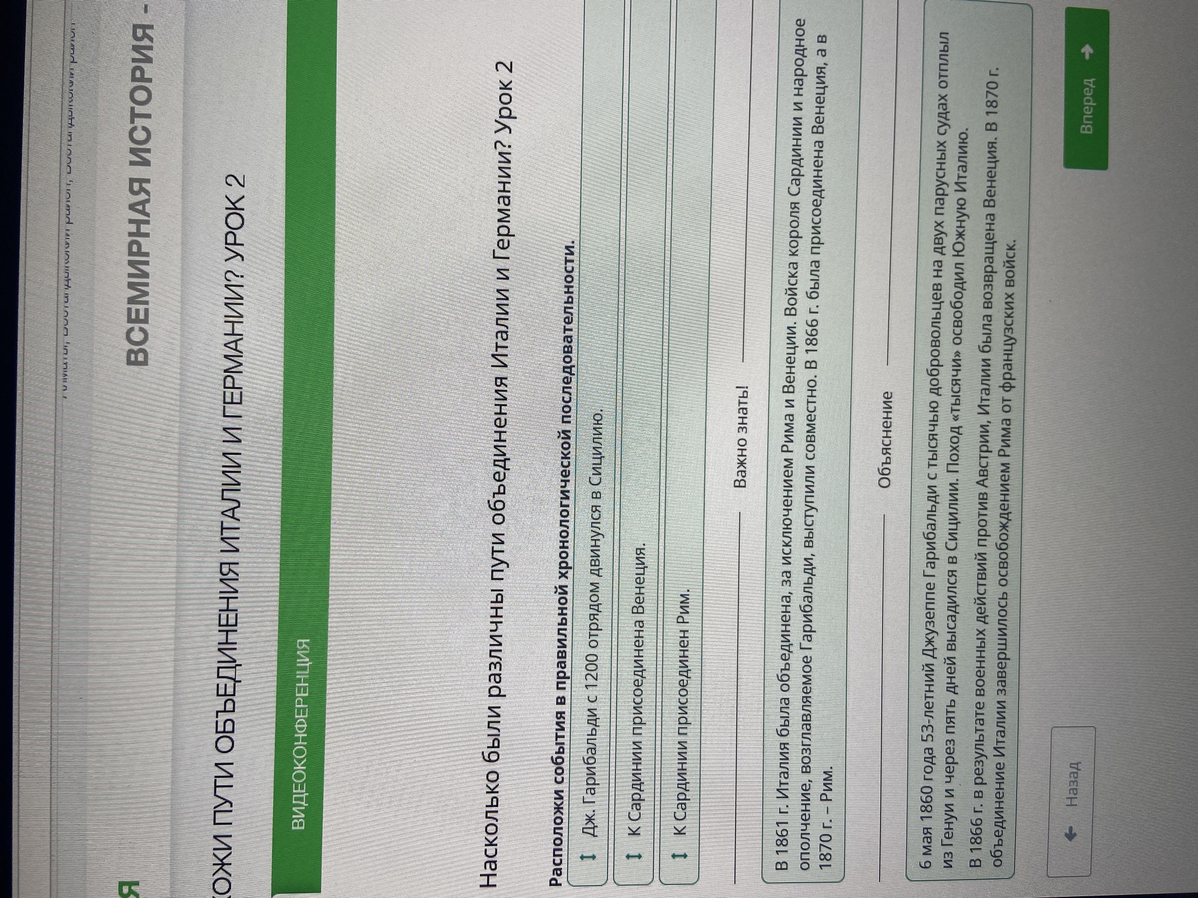 СРОЧНО ДАМ 30 БАЛЛОВ Насколько были различны пути объединения италии и германии? урок 2 расположи события в правильной хронологической последовательности. к сардинии присоединена венеция. дж. гарибальди с 1200 отрядом двинулся в сицилию. к сардинии присоединен рим.