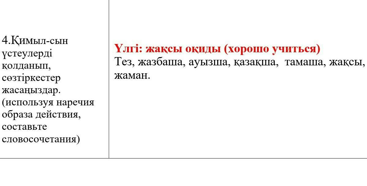 тез жетті,(быстро добрался), жазбаша орындады ( письменно выполнил,), ауызша жауап берді,( устно ответил),қазақша біледі, ( знает по-казахски), тамаша күн, (прекрасный день), жақсы адам, (хороший человек), жаман мінез( плохой характер)