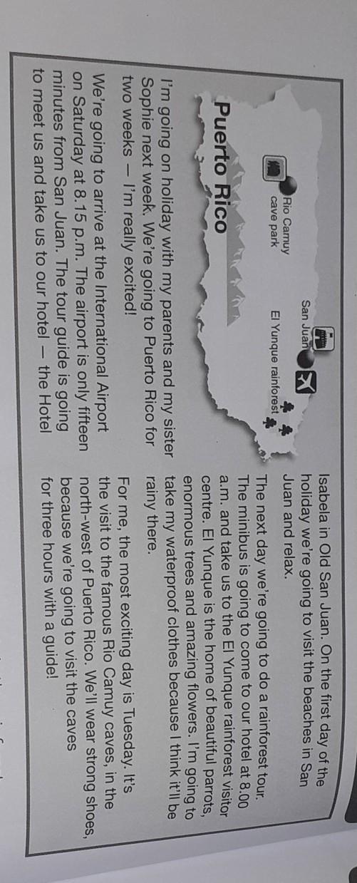 They' re going to visit the caves in the north-west of Puerto Rico. They also want to explore the beautiful green rainforest and go to the visitor guide there.