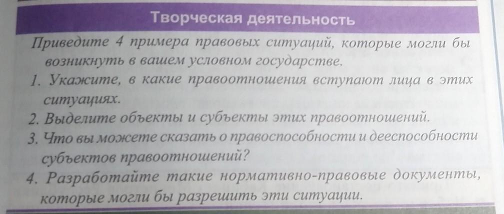 Приведите 4 примера правовых ситуаций, которые могли бы возникнуть в вашем условном государстве.