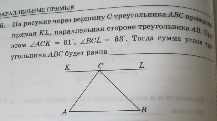 на рисунке через вершину C треугольника ABC проведена прямая KL параллельна стороне треугольника AB при этом угол AC равно 61 градус угол BCL равно 63 градуса тогда сумма углов треугольника ABC будет равна