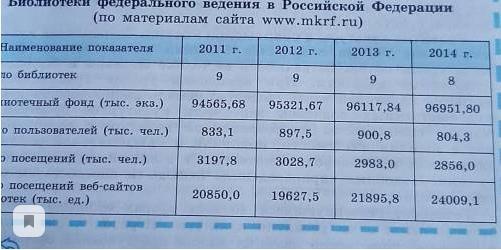 Номер 4.Ознакомтесь со статистическими данными, указанными в параграфе 5 о библиотеках, находящихся в федеральном ведении. Из этих показателей выделите такие, которые свидетельствуют о реальном посещении библиотек читателями и посещении веб-сайтов библиотек Составьте графики, отражающие динамику этих показателей за периода 2010 по 1014 г.