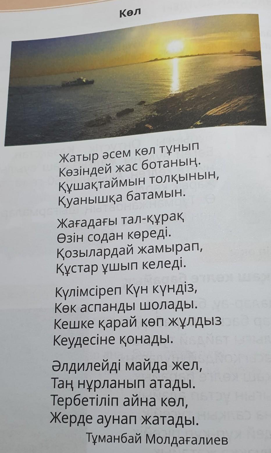 Бұл жердегі көл жағасын: тас басқандай көрініп тұр. Мұнда сап-сары әдемі күн көрініп тұр. Мөлдір судың үстінде әп әдемі қайық үйрек сияқты жүзіп жатыр.