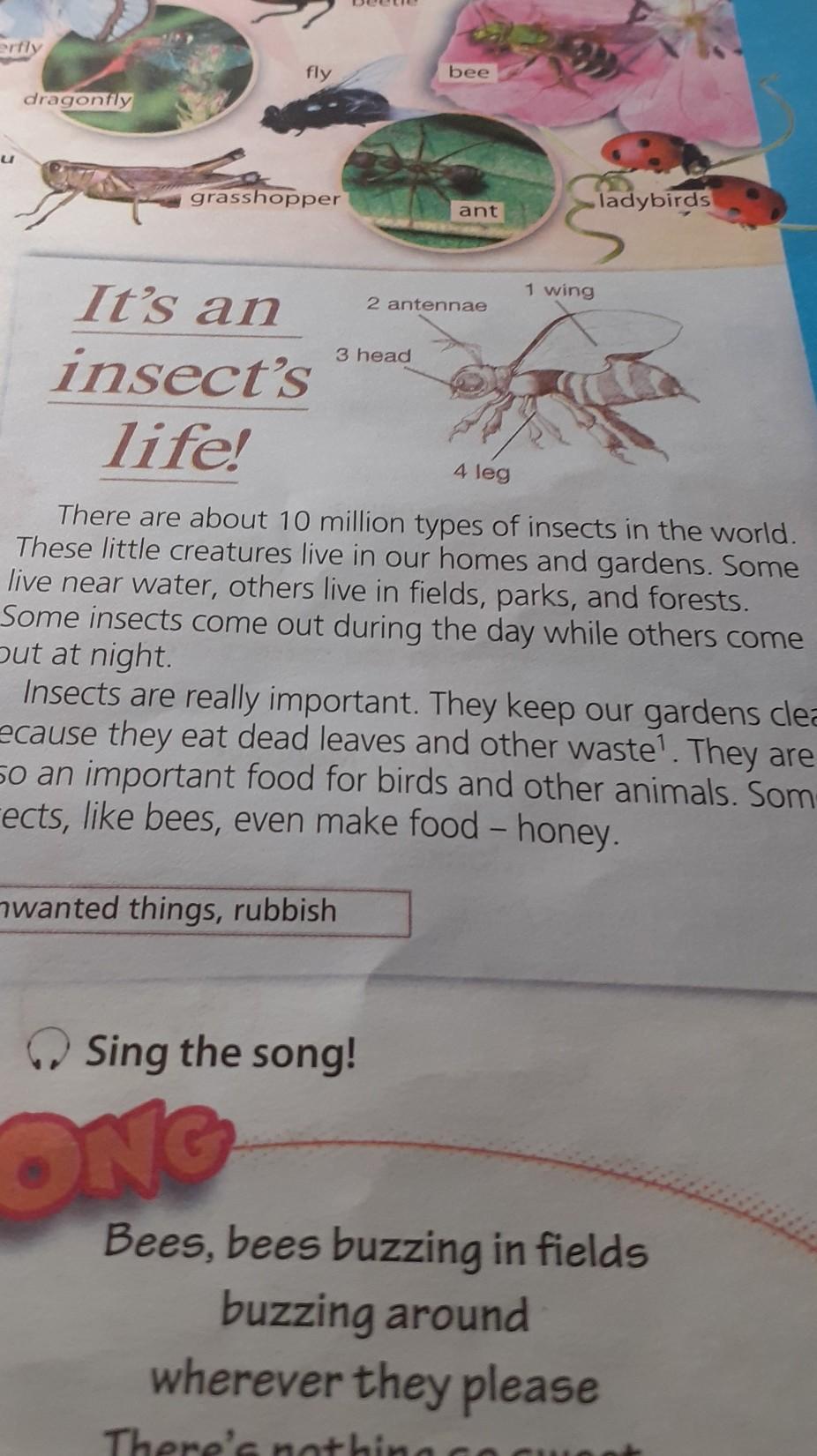 В мире насчитывается около 10 миллионов видов насекомых. Эти маленькие создания живут в наших домах и садах. Некоторые живут у воды, другие - в полях, парках и лесах. Некоторые насекомые выходят днем, а другие - только ночью. Насекомые действительно важны. Они держат наши сады в чистоте, потому что едят мертвые листья и другие отходы. Они являются важной пищей для птиц и других животных. Некоторые, как пчелы, даже готовят еду - мед.