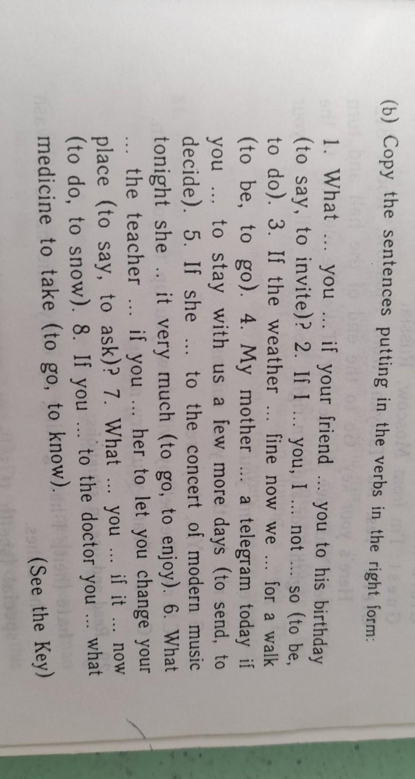 помогите пожалуйста 1. What .. you ... if your friend ... you to his birthday (to say, to invite)? 2. IfI. you, I.. not . so (to be, to do). 3. If the weather ... fine now we ., for a walk (to be, to go). 4. My mother . a telegram today il to stay with us a few more days (to send, to to the concert of modern music you ... decide). 5. If she tonight she .. it very much (to go, to enjoy). 6. What if you .. the teacher ... her to let you change your if it .. now place (to say, to ask)? 7. What (to do, to snow). 8. If you medicine to take (to go, to know). ... you ... to the doctor you .. what medicine to take (to go, to know).