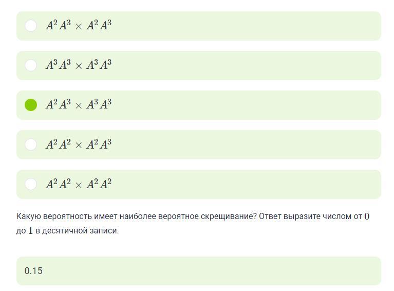 В популяции имеются три аллели гена A и присутствуют шесть генотипов, частоты которых составляют: p(A1A1)=4%, p(A2A2)=9%, p(A3A3)=25%, p(A1A2)=12%, p(A1A3)=20%, p(A2A3)=30%. Два родителя разного пола случайно скрещиваются, не имея каких-либо предпочтений по генотипу партнера. Скрещивание особей с какими генотипами наиболее вероятное в этой популяции?