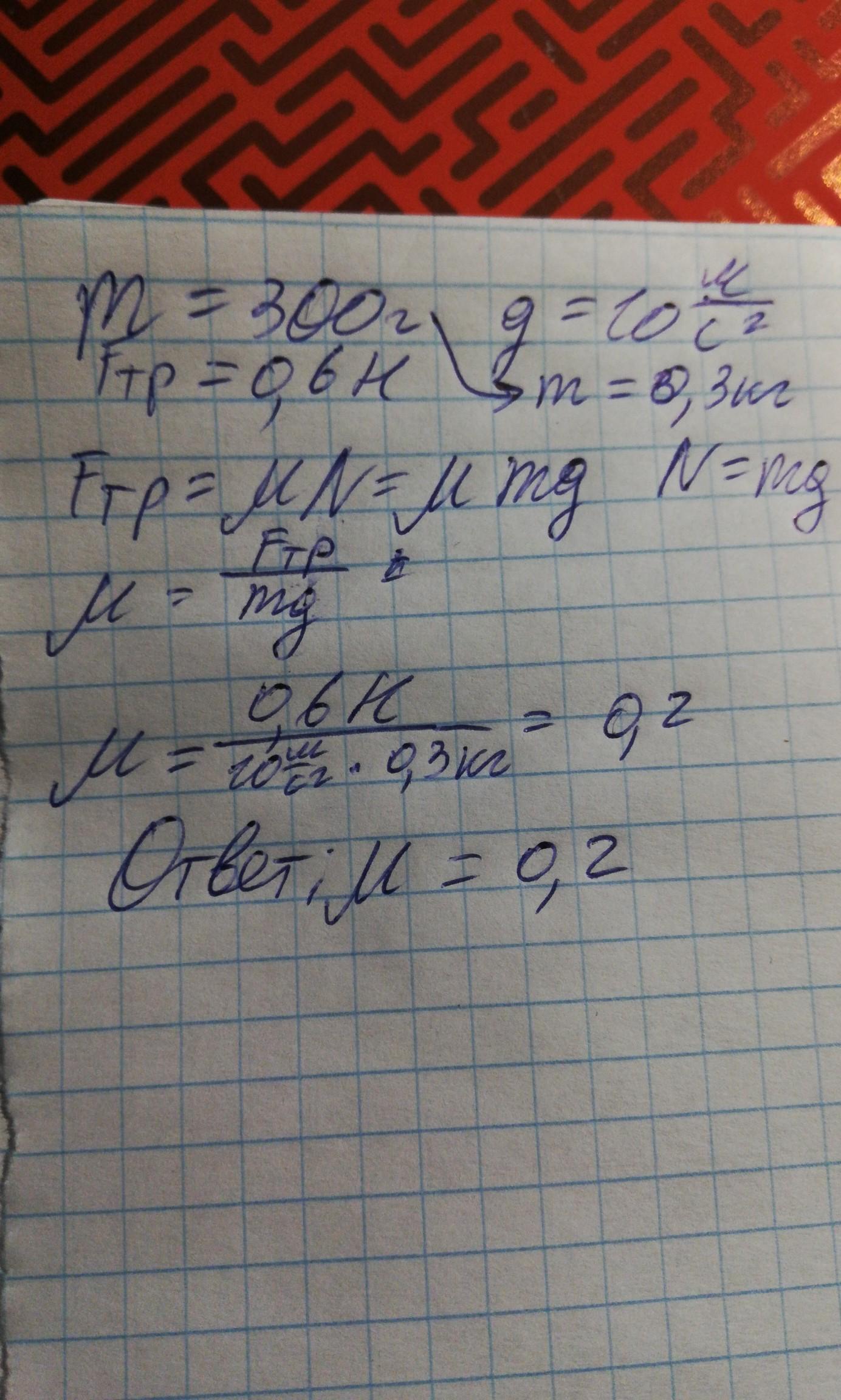 Брусок массой 300г двигают горизонтально. Сила трения при этом равна 0,6Н. Определите коэффициент трения